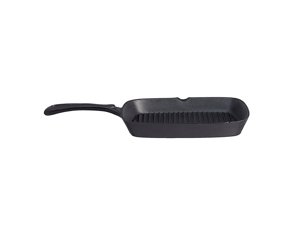 Fyrkantig grillpanna 23x23cm. Sput på vänster sida. Gjutjärnshandtag. Förkryddad med KRAV-certifierad rapsolja.