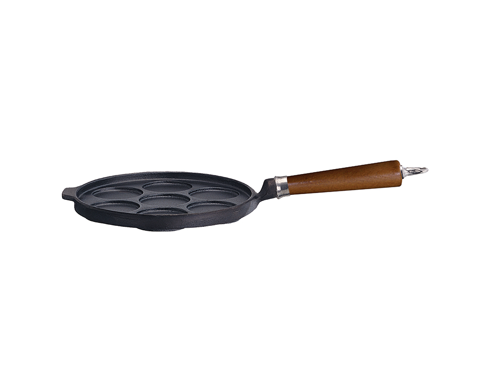 Plättpanna med urtag för 7 runda småplättar. Brunlaserat skaft av massiv bok. Förinstekt med svensk KRAV-märkt rapsolja. Bottenmått på undersidan Ø22,5cm. Vikt ca 2,8kg.