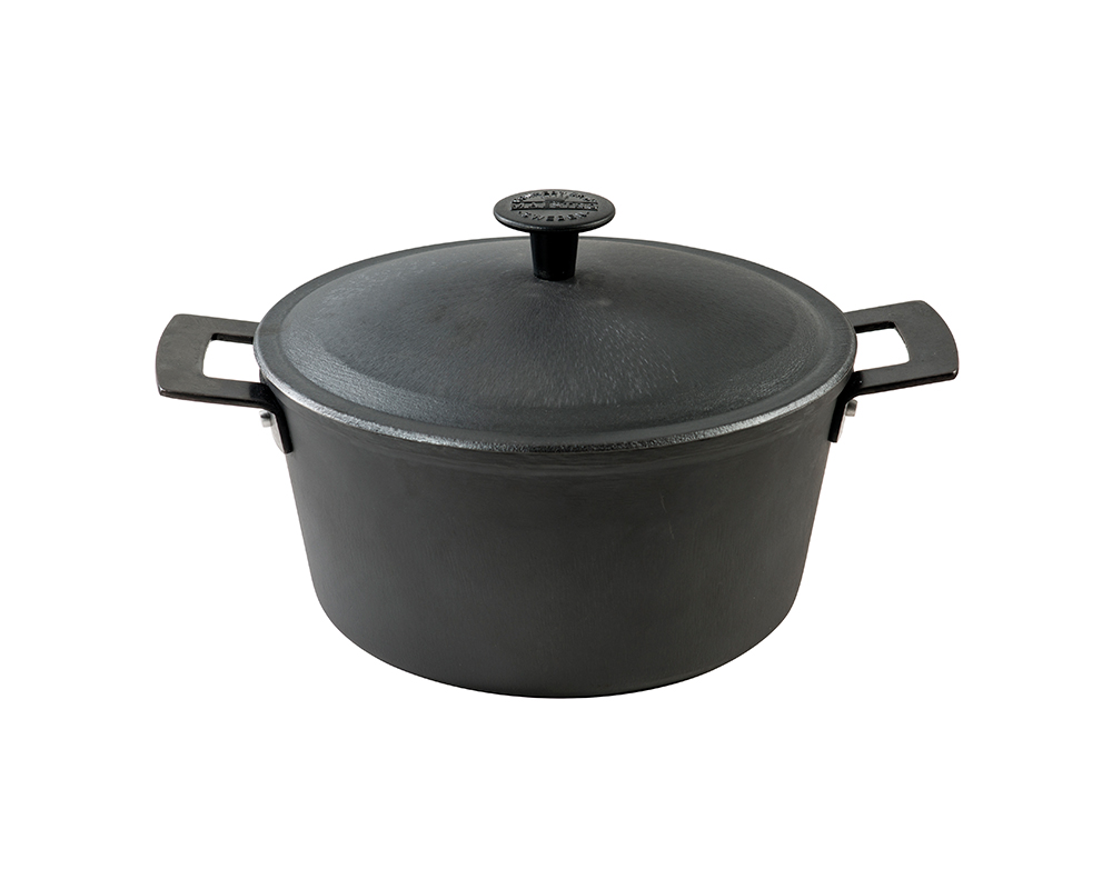 Lätt gjutjärnsgryta 4 liter, rund Ø24cm. Gjutjärnslock med bakelitknopp som tål ugnsvärme till ca 220ºC. Undersidans diameter ca 19cm. Kanthöjd ca 12cm. Vikt ca 3,1kg. Dubbla smidda handtag.