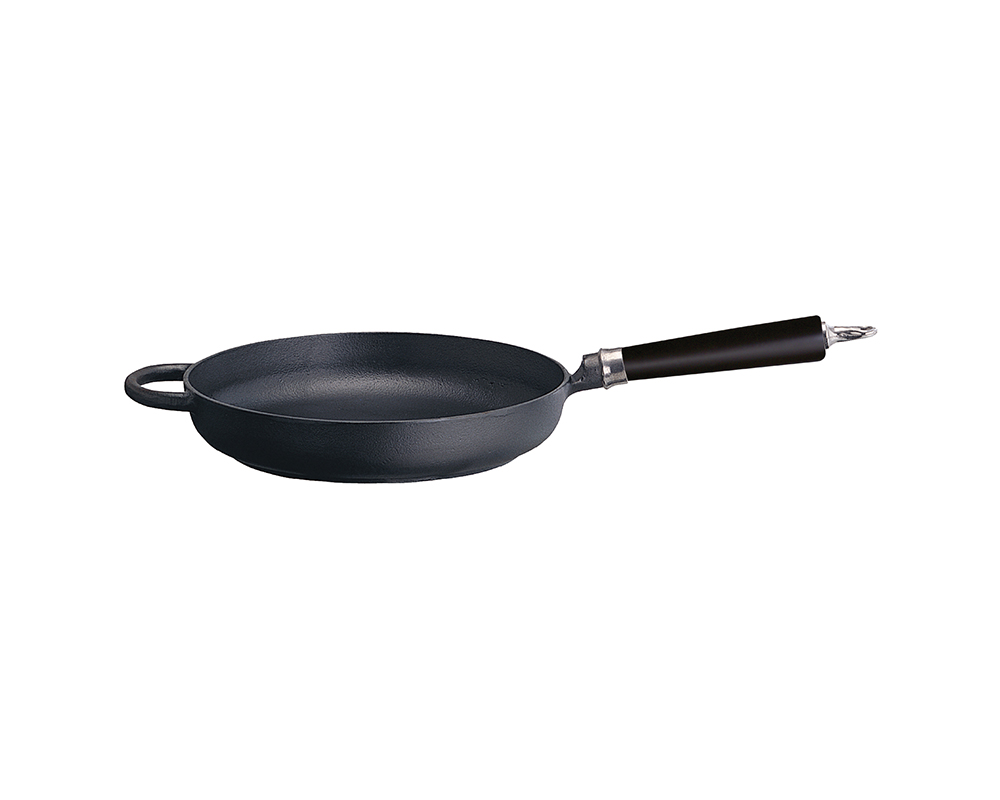 Stekpanna Ø28cm med rund kant. Svartlaserat skaft av bokträ. Förinstekt med svensk KRAV-märkt rapsolja. Bottenmått på undersidan Ø22,5cm. Kanthöjd ca 5cm. Vikt ca 3,1kg.
