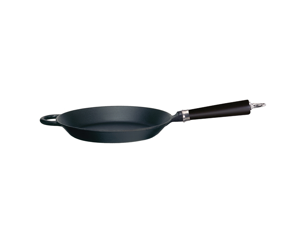 Stekpanna Ø28cm med sned kant. Svartlaserat skaft av massiv bok. Förinstekt med svensk KRAV-märkt rapsolja. Bottenmått på undersidan Ø20,7cm. Vikt ca 2,7kg.