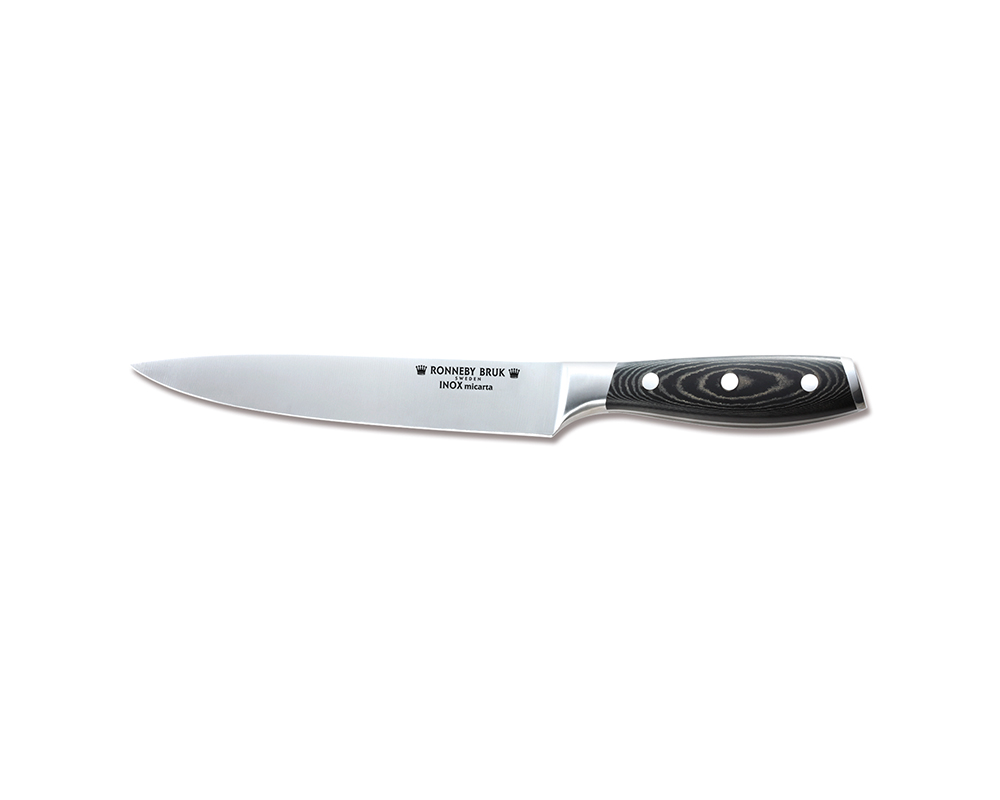 INOX Micarta. Förskärare med skaft av micarta, som är ett tåligt och vackert kompositmaterial. Knivens klinga ca 20cm, skaftet är ca 13cm långt. Knivens vikt är ca 190gr. Kniven kan diskas i diskmaskin, men alla knivar mår bättre av att handdiskas. Eventuella fläckar eller färgförändringar efter maskindiskning omfattas ej av vår garanti.