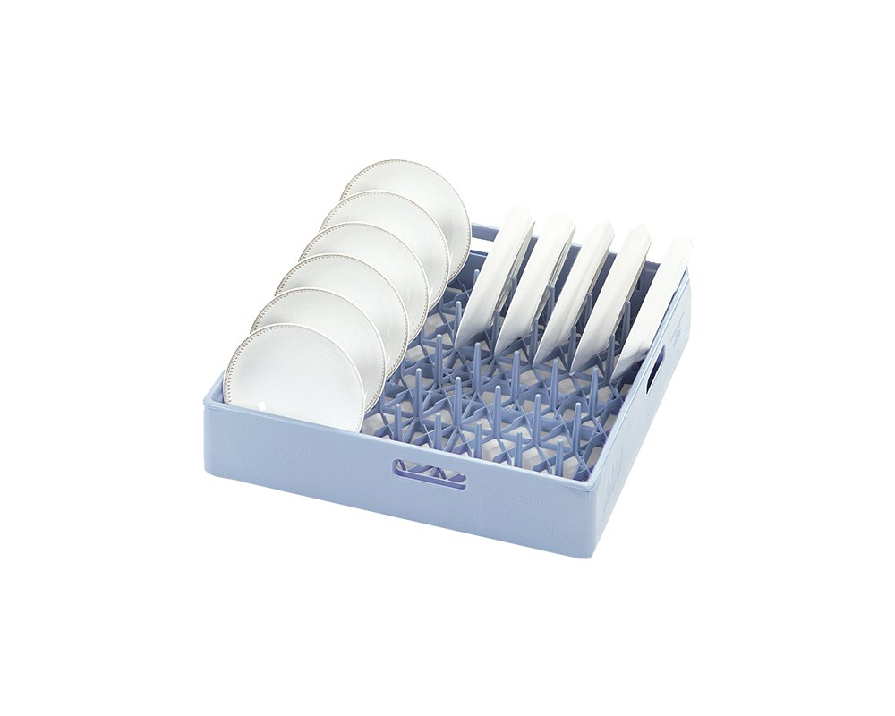 Staplingsbar diskkorg i blå polypropylenplast för diskning av flata och djupa tallrikar. 50x50cm Höjd10,6cm Vikt1,5kg