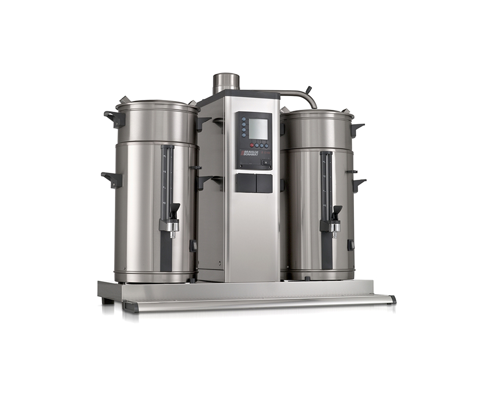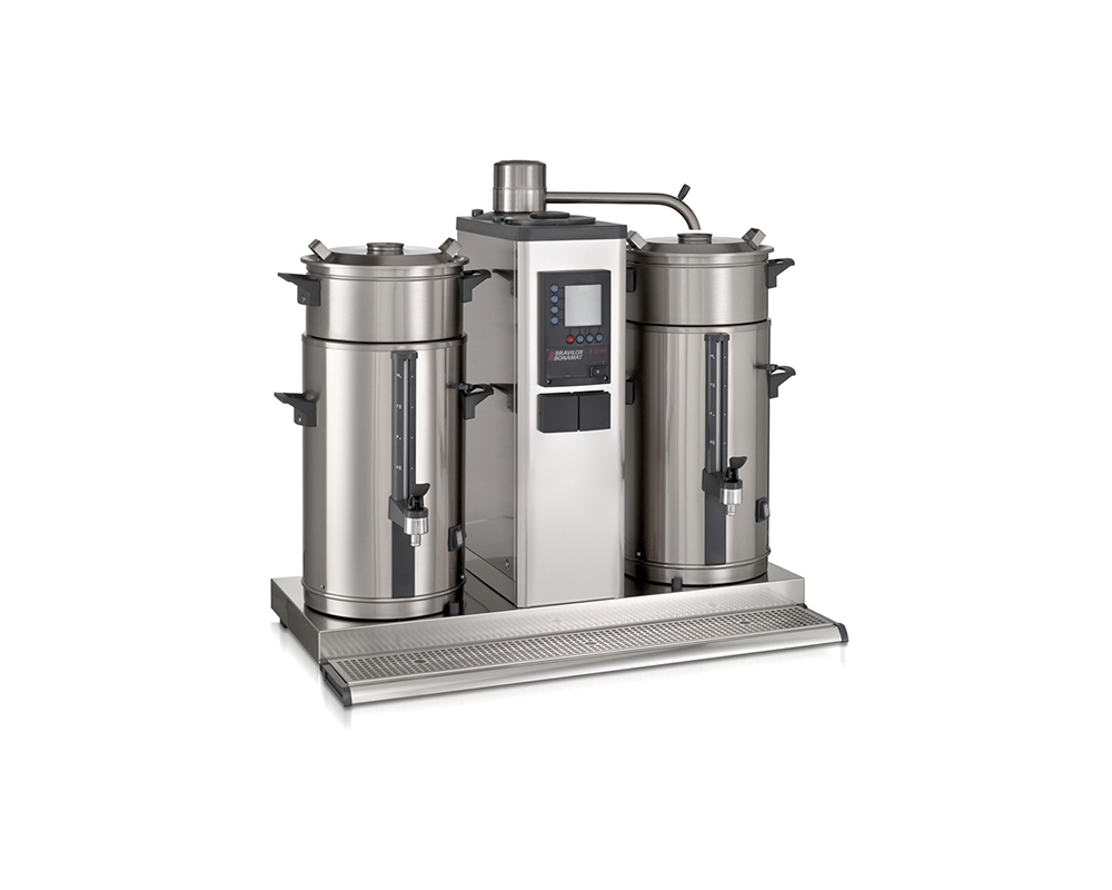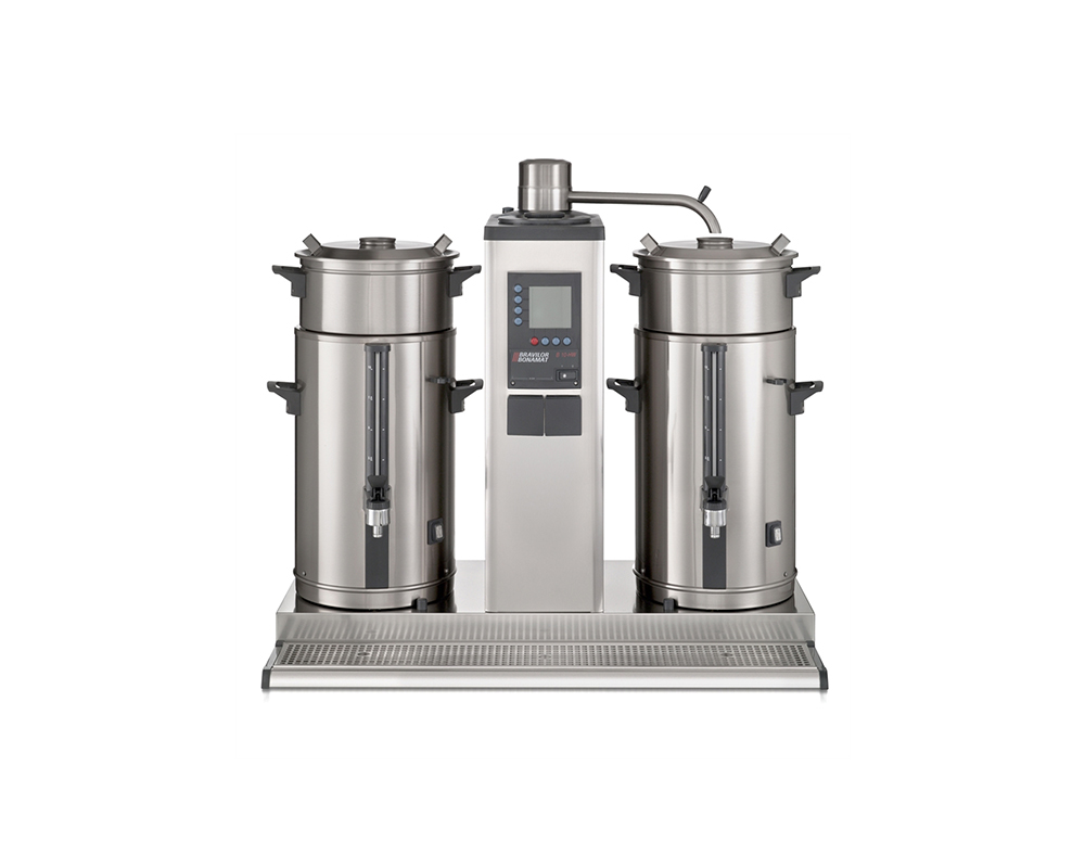 Bryggare B10 med 1 bryggpelare, 2 behållare (20 liter) för korgfilter och vattenanslutning. Brygger stora mängder kaffe i lösa behållare. Utrustad med LCD-display, räkneverk för total- och dagsmängd, avkalkningssystem, ger signal när bryggningen är klar, inbyggd timer och optimalt skydd.