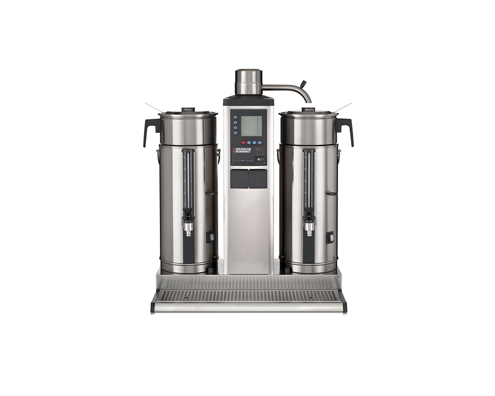 Bryggare B5 med 1 bryggpelare, 2 behållare (10 liter) för korgfilter och vattenanslutning. Brygger stora mängder kaffe i lösa behållare. Utrustad med LCD-display, räkneverk för total- och dagsmängd, avkalkningssystem, ger signal när bryggningen är klar, inbyggd timer och optimalt skydd.