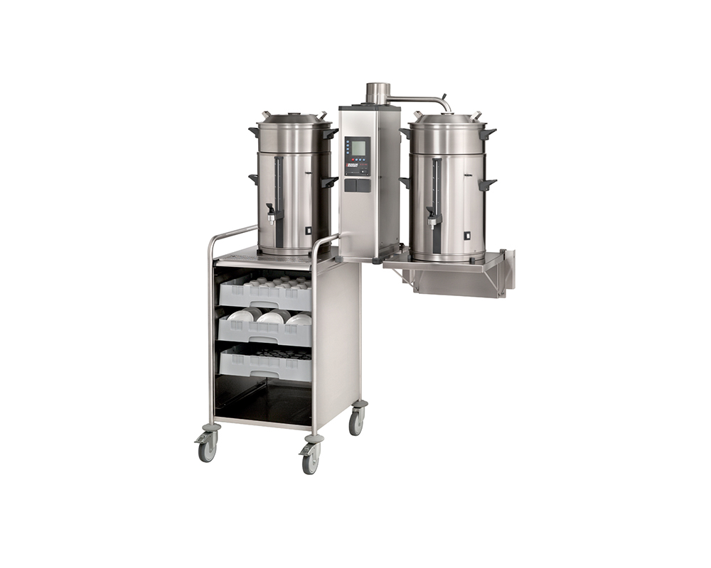 Bryggare B5 W L/R 1 bryggpelare, 1 behållare till vänster eller höger (5 liter) för korgfilter och vattenanslutning. Brygger stora mängder kaffe i lösa behållare. Apparaten kan enkelt monteras på väggen. Utrustad med LCD-display, räkneverk för total- och dagsmängd, avkalkningssystem, ger signal när bryggningen är klar, inbyggd timer och optimalt skydd.