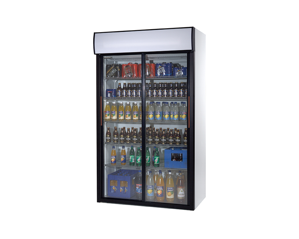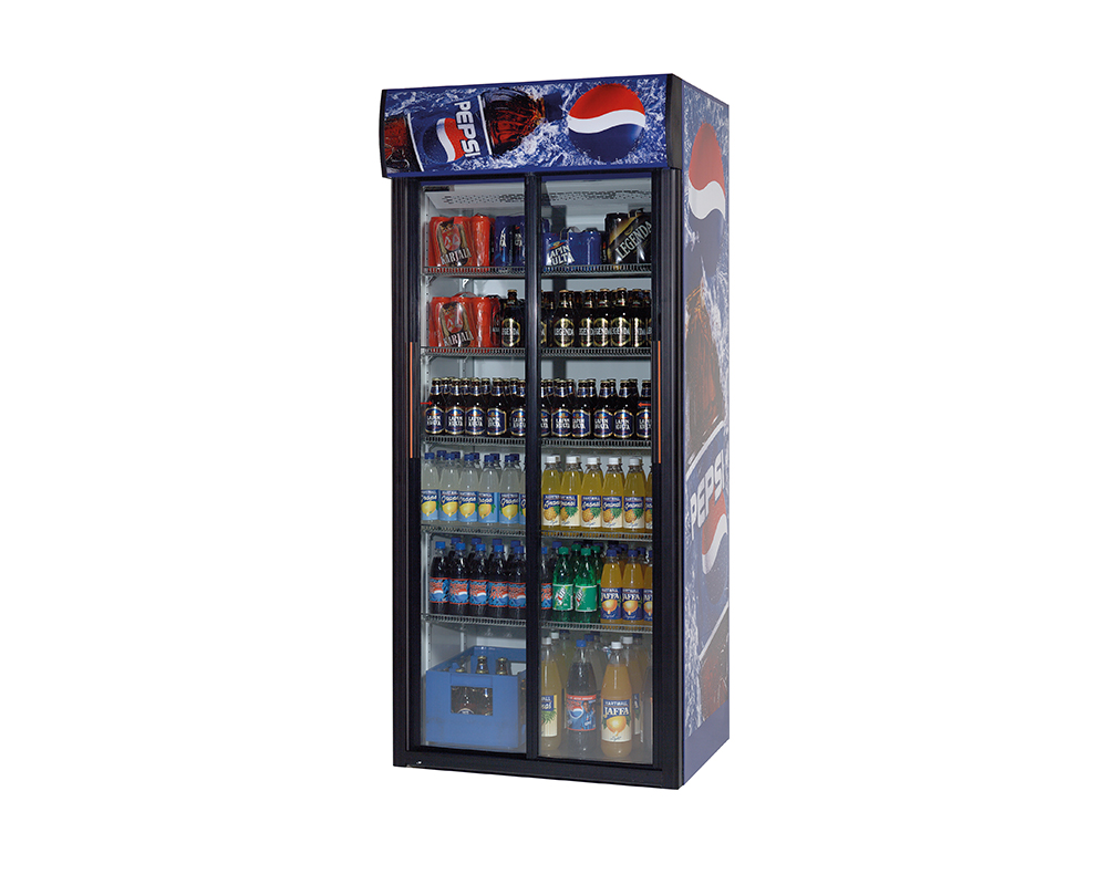 Exponeringskylskåp Festivo i stål med 5st trådgallerhyllor, belysning med belyst toppskylt, fläktkyld och självstängande skjutglasdörrar. Finns i två storlekar.