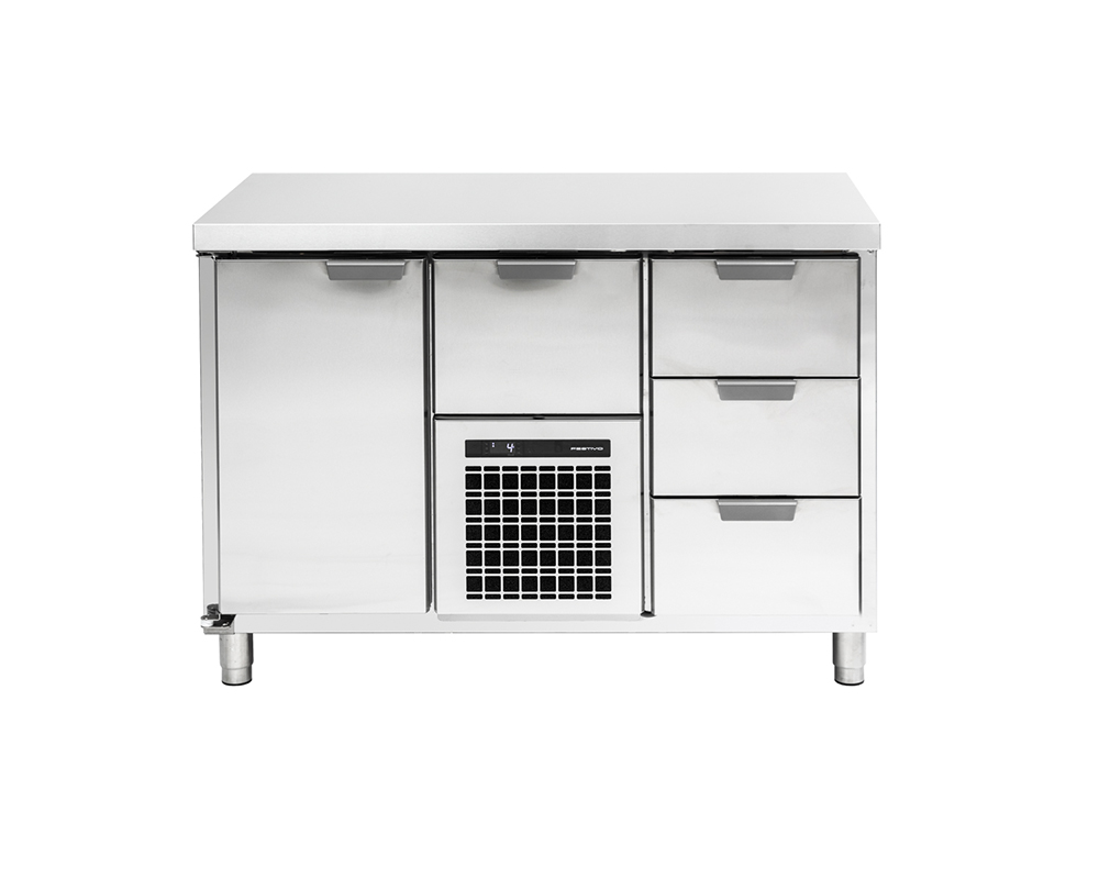 Kylbänk i rostfritt stål med slät toppskiva, lådor med mjukstängande expansionsbeslag anpassad för GN1/1. Finns i fyra utföranden.