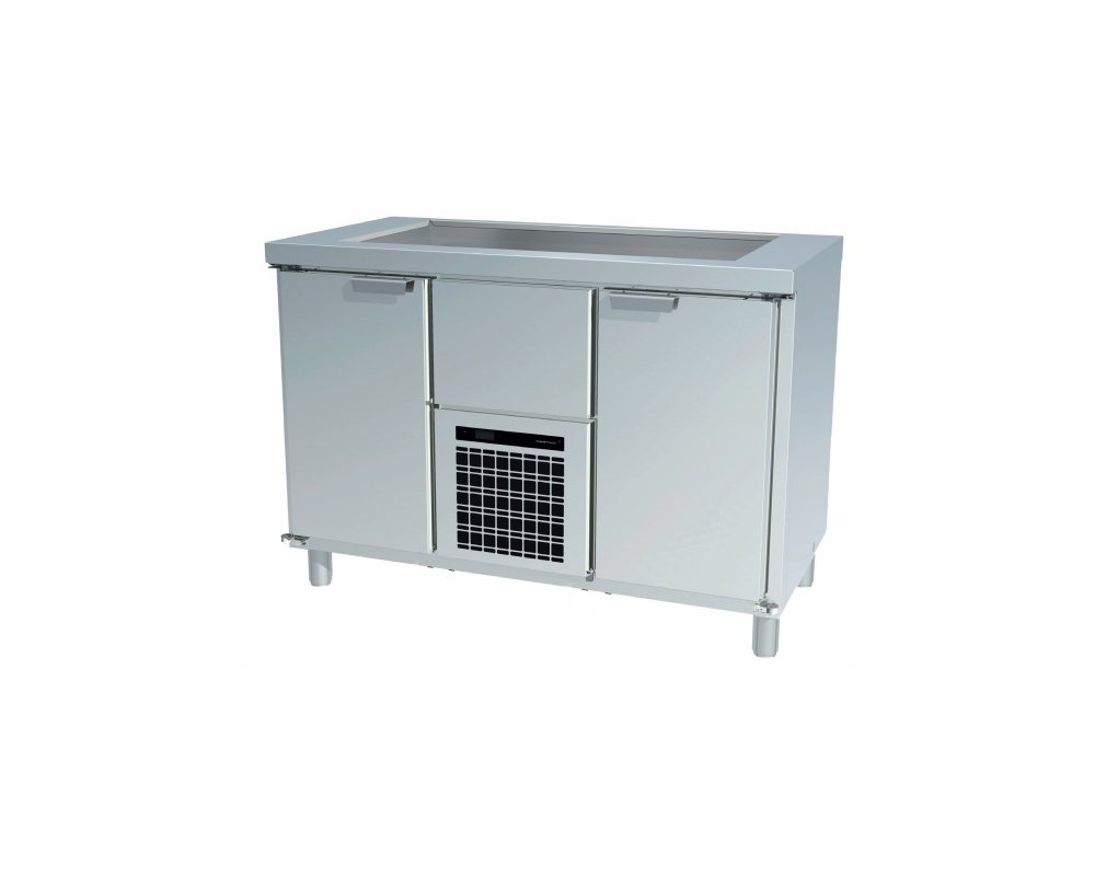 Kylbänk med flaskbrunn i rostfritt stål. Fläktkyld brunn djup 21cm, elektroniskt styrning med skyddslucka, epoxilackad förångare och automatisk avdunstning av tövatten. Finns i tre utföranden.