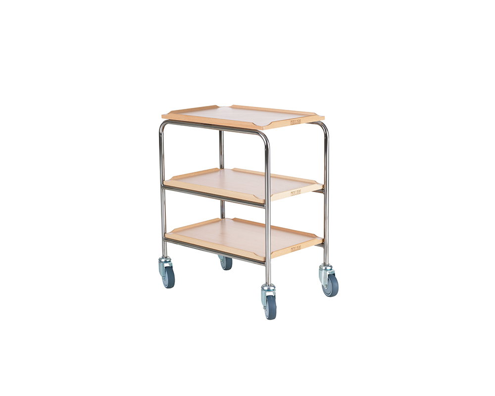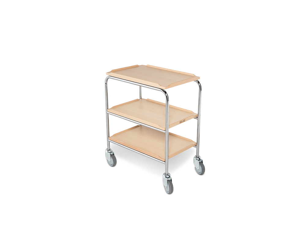Minirullbord med tre laminatskivor i bok med skivmått 60x40cm och ställning av kromade stålrör. Max belastning 100kg.
