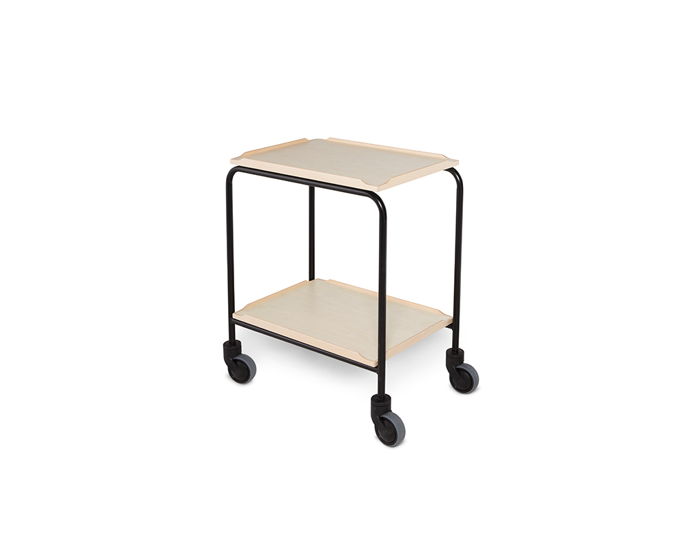 Svensktillverkat serveringsbord med två laminatskivor i björk med skivmått 60x40cm och ställning av svarta pulverlackerade stålrör. Laminatskivorna har trälist runt om som är nedfräst i hörnen. Fyra svängbara hjul och max belastning på 100kg.