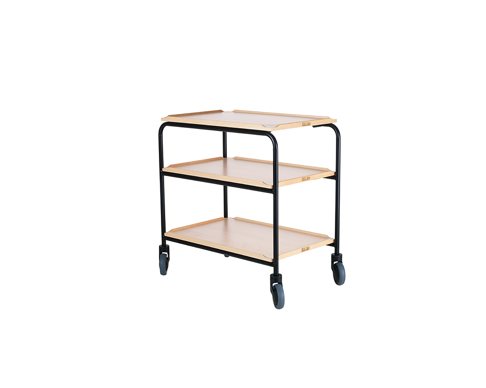 Serveringsbord med 3 laminatskivor i bok och ställning i svarta pulverlackerade stålrör. Fyra svängbara hjul och max belastning på 100kg. 90x55cm höjd90cm