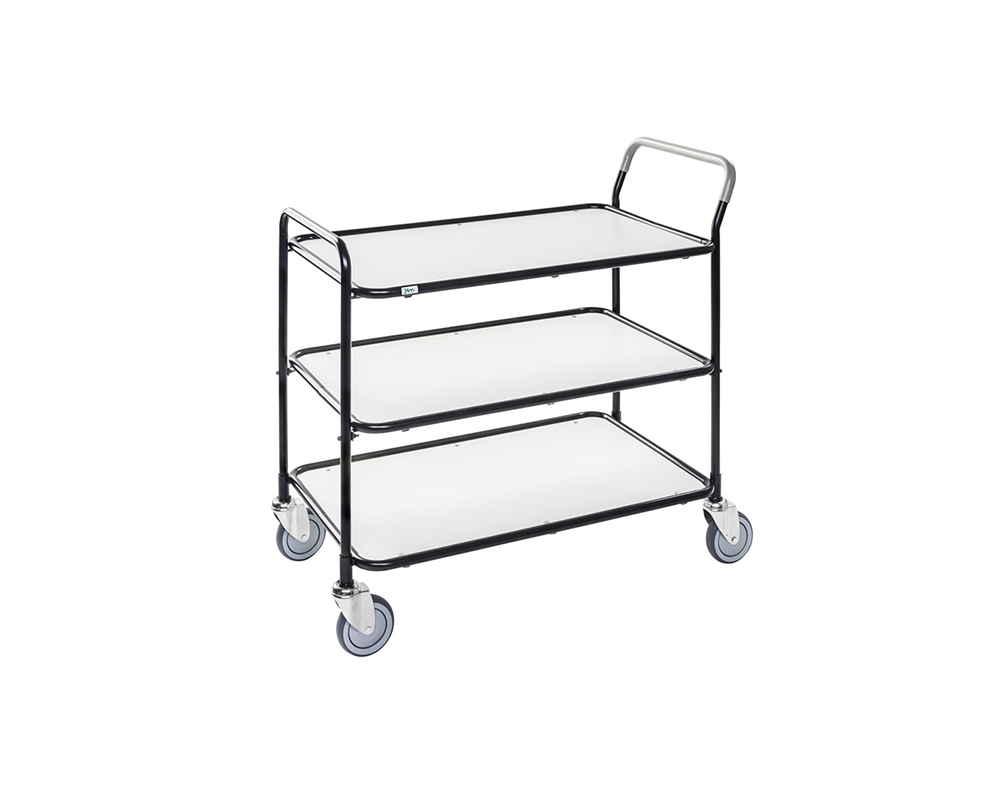 Mindre bordsvagn i 3 plan. Plastbeklätt handtag som motverkar kalla händer. Hyllplan av laminat. Levereras omonterad. Finns i 4 färger.