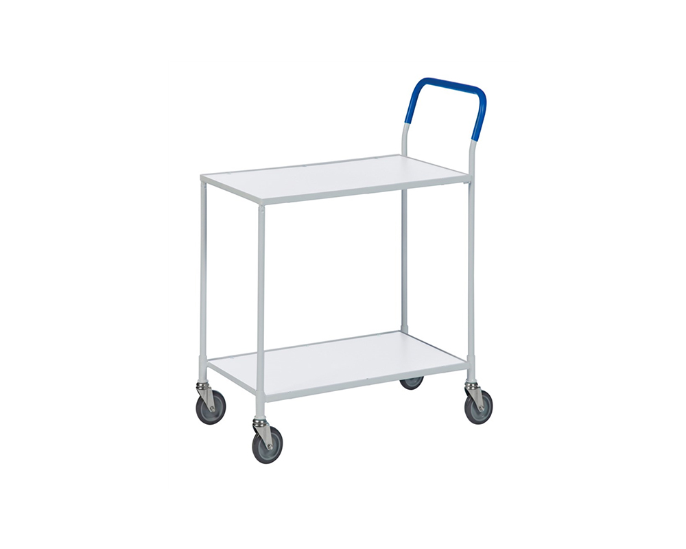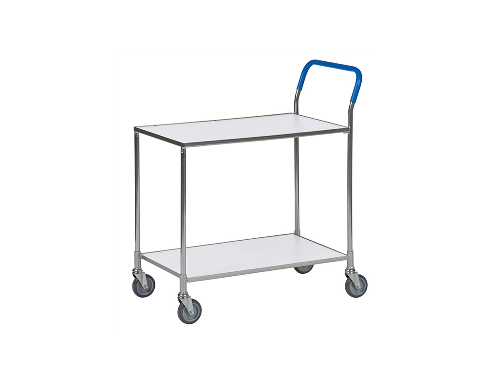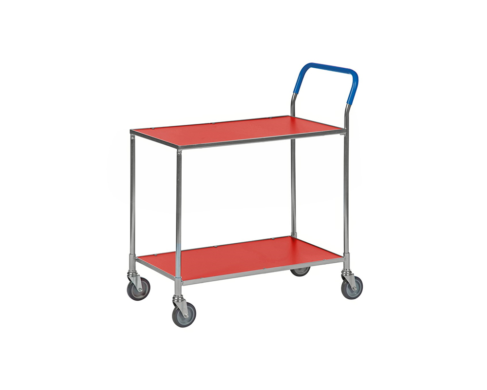 Mindre bordsvagn i 2 plan utan broms. Plastbeklätt handtag som motverkar kalla händer. Hyllplan av laminat. Finns i fem färger. Levereras omonterad.