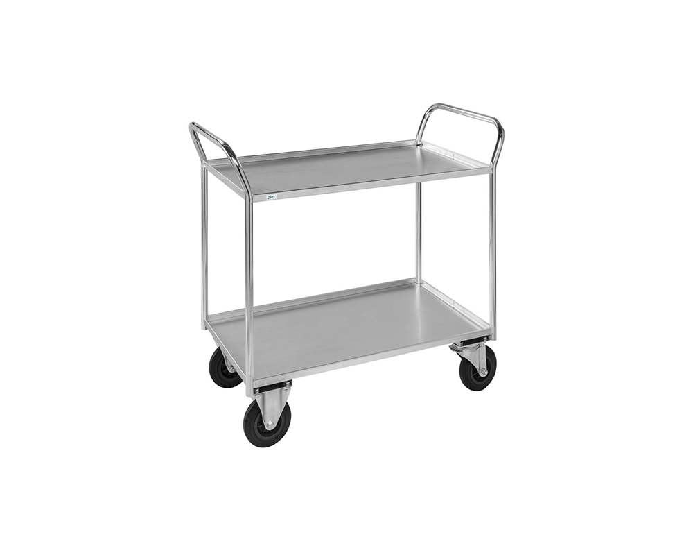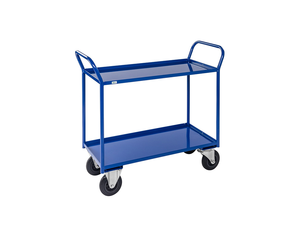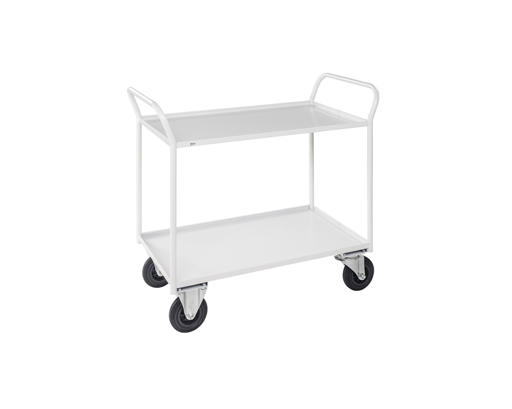 Vit hög helsvetsad robust plåtvagn utan broms i 2 plan med kant. Lämpar sig för de tyngre lasterna i de riktigt tuffa miljöerna. Finns i tre färger.