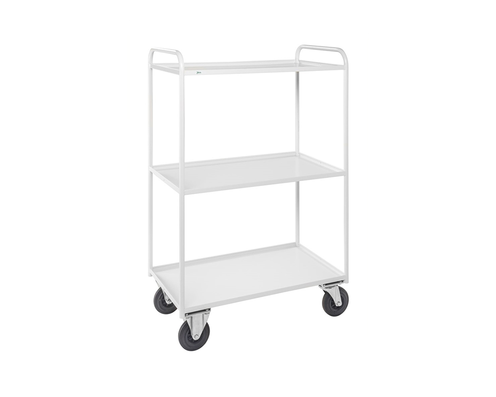 Vit hög helsvetsad robust plåtvagn med broms i 3 plan med kant. Lämpar sig för de tyngre lasterna i de riktigt tuffa miljöerna. Finns i tre färger.