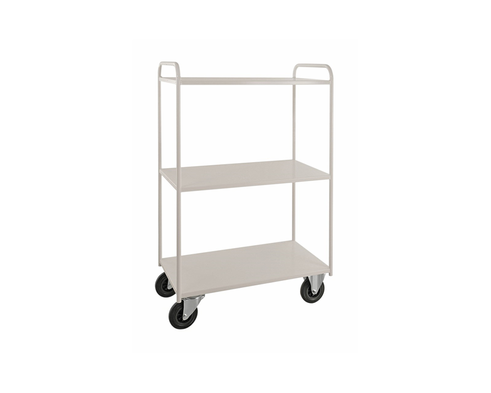 Vit hög helsvetsad robust plåtvagn utan broms i 3 plan utan kant. Lämpar sig för de tyngre lasterna i de riktigt tuffa miljöerna. Finns i tre färger.