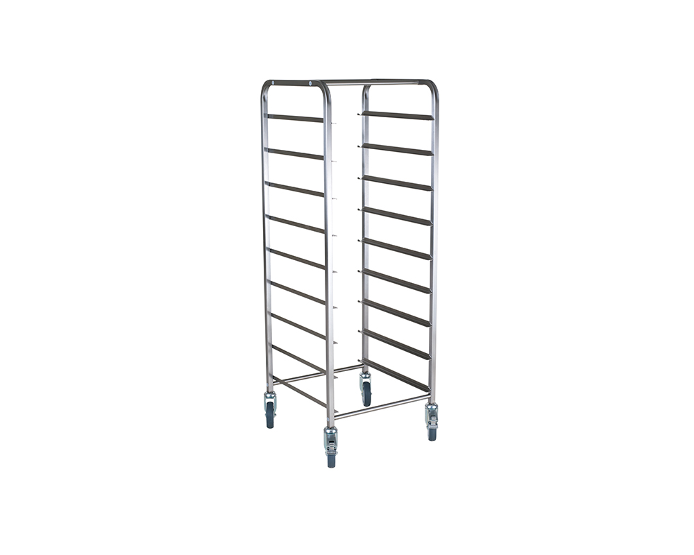 Korgvagn i rostfritt material för 9st korgar 50x50cm och gejdrar med stopp i en ände. Delning mellan gejdrar är 15cm. Fyra svängbara hjul varav två bromsbara. Avvisarhjul.