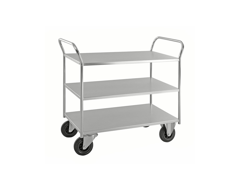 Vit helsvetsad robust plåtvagn med broms i 3 plan utan kant. Lämpar sig för de tyngre lasterna i de riktigt tuffa miljöerna. Finns i tre färger.