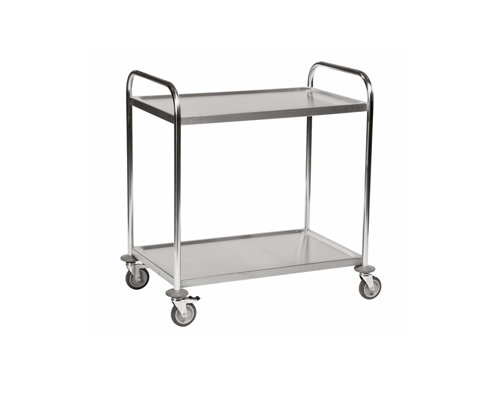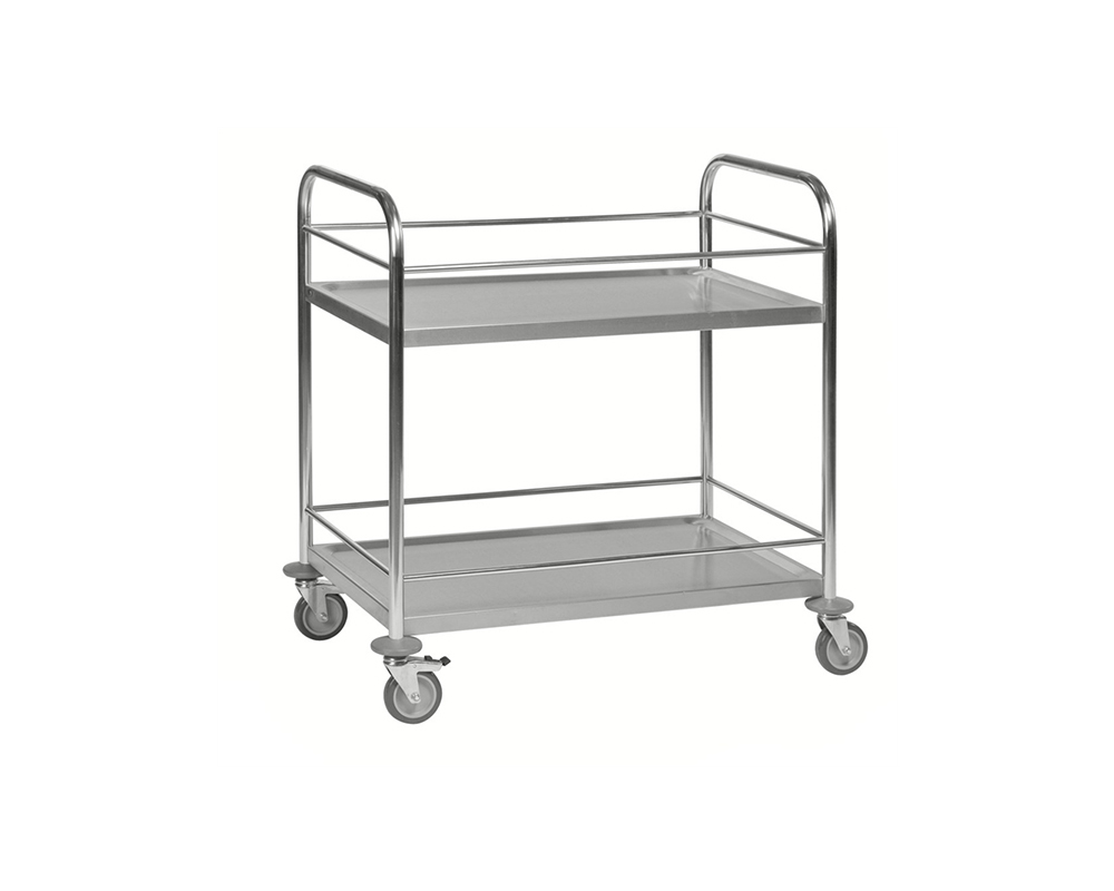 Enkel rostfri vagn i 2 plan med sarg som passar i de flestra områden. Släta hyllplan som gör den lätt att torka av. Levereras omonterad.