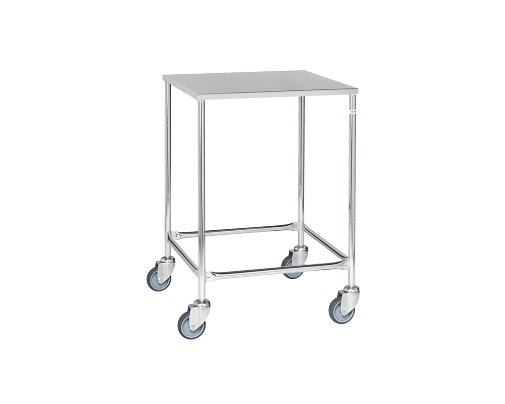 Elegant helsvetsad rullvagn med broms och hyllplan av spån, klädda i rostfri plåt.