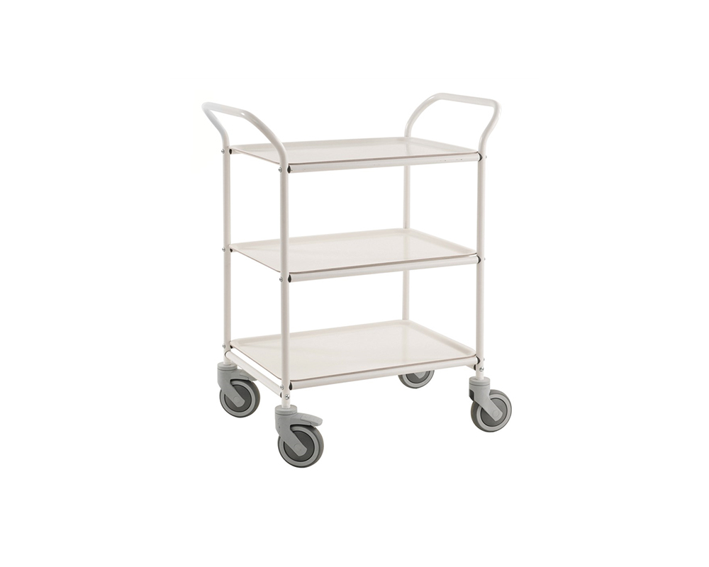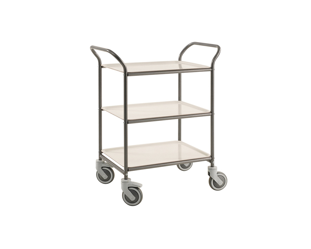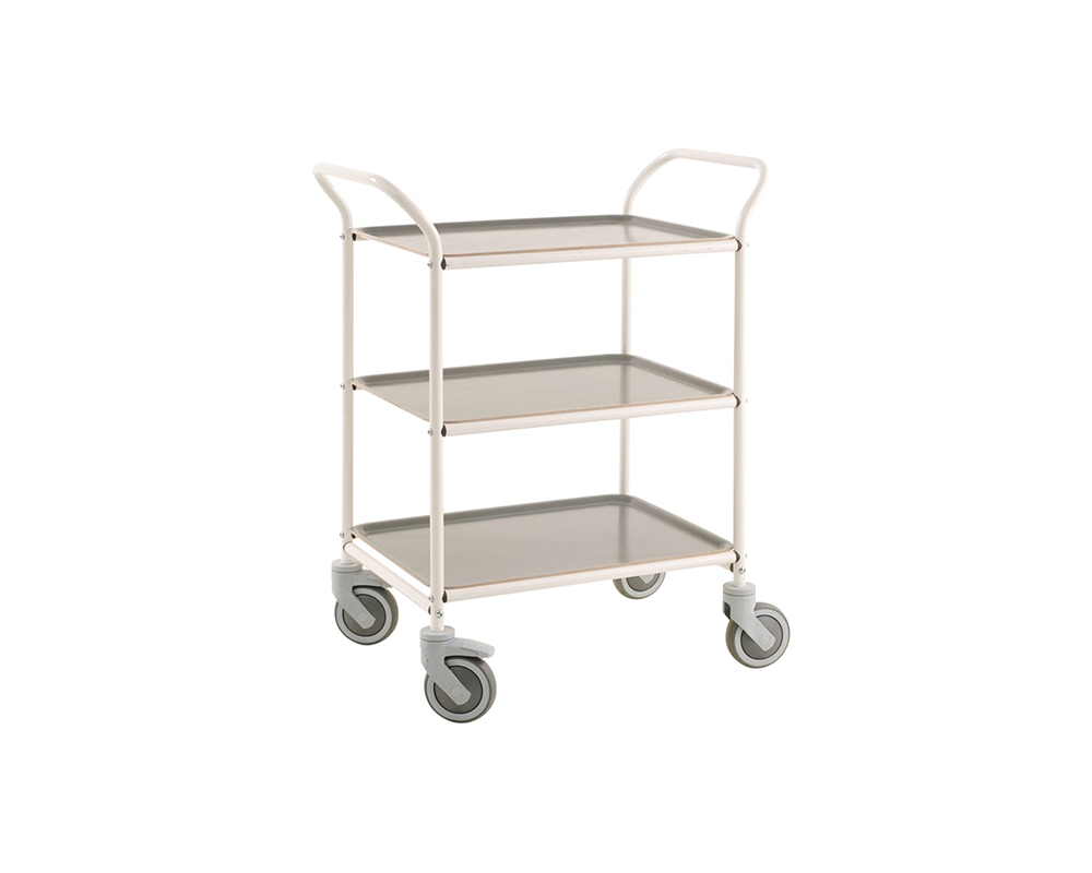 Enkel och snygg serveringsvagn i 3 plan med 2 bromshjul. Brickorna tar man smidigt bort för servering och är lätta att torka av. Finns som standard i 9 färger som gör att man enkelt kan komponera sin egna färgkombination. Levereras omonterad.