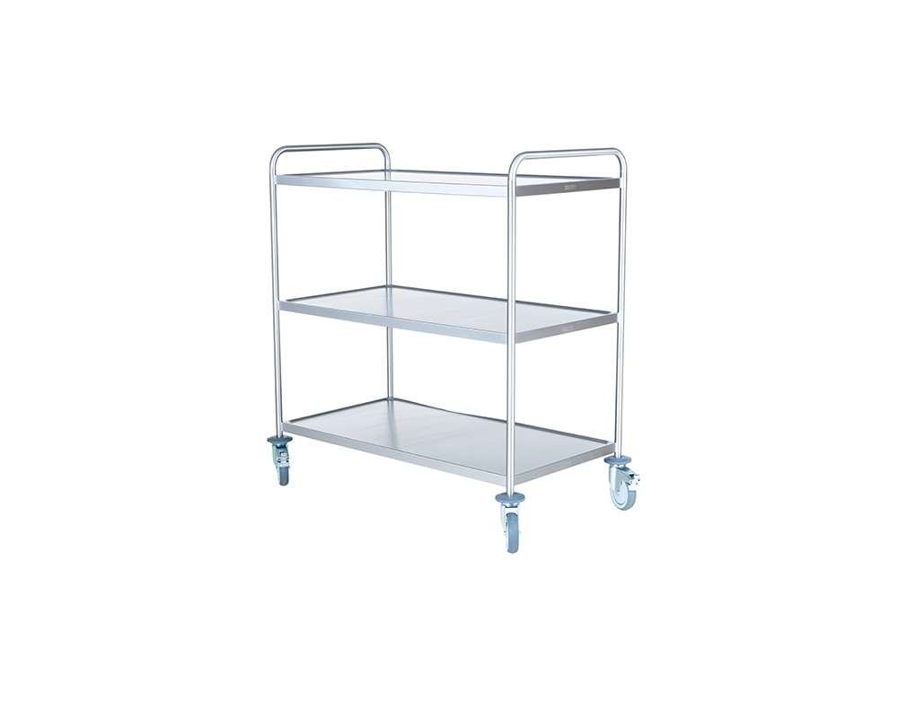 Storköksvagn med tre rostfria skivor 107x57cm och handtag. Skivorna har dämpmatta på undersidan och vulstkant. Fyra svängbara hjul varav två med bromsar. Avvisarhjul och max belastning på 100kg.