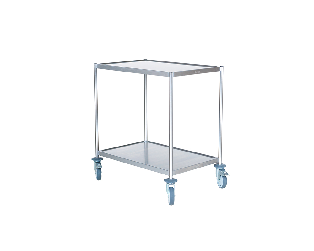 Storköksvagn utan handtag med ställning och 2 skivor 80x52cm i rostfritt. Skivorna har dämpmatta på undersidan och vulstkant. Fyra svängbara hjul varav två bromsbara. Avvisarhjul och max belastning 80kg.