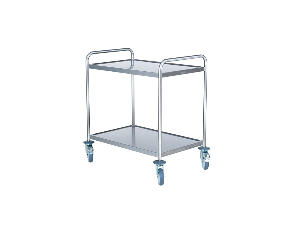 Storköksvagn med två rostfria skivor 90x55cm och handtag. Skivorna har dämpmatta på undersidan och vulstkant. Fyra svängbara hjul varav två med bromsar. Avvisarhjul och max belastning på 100kg.