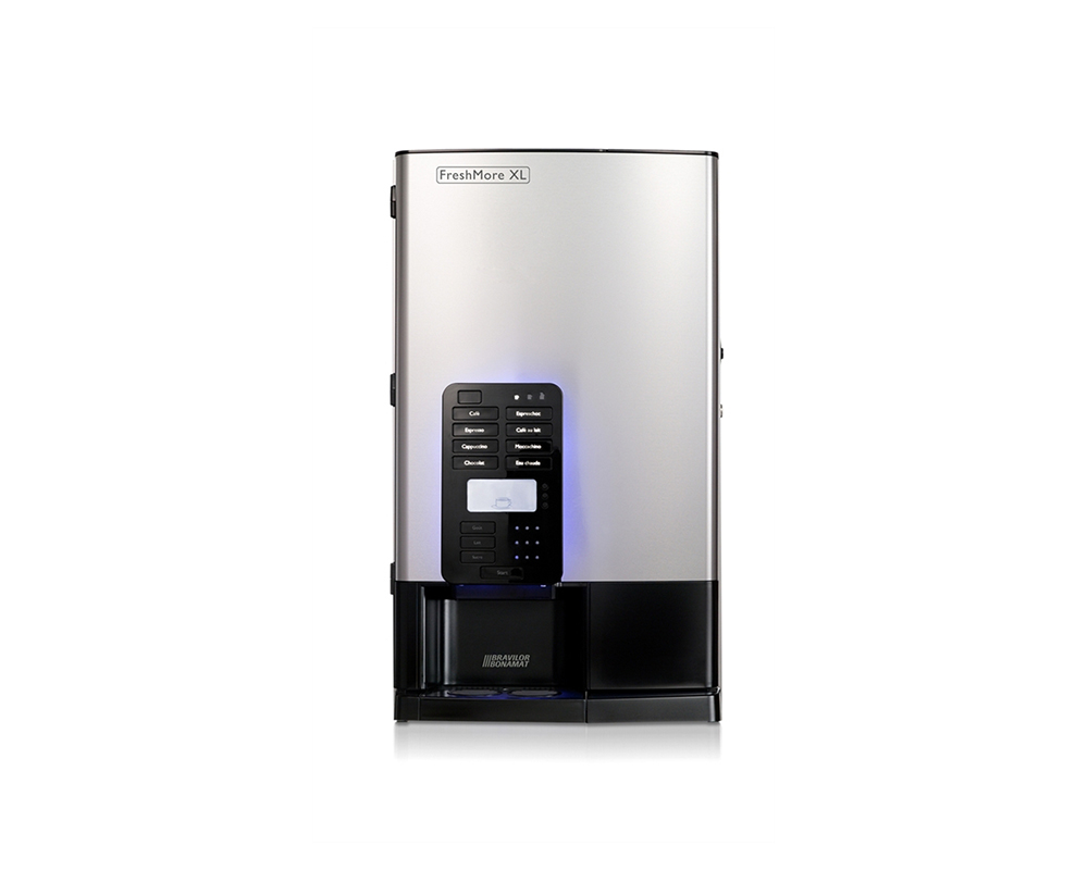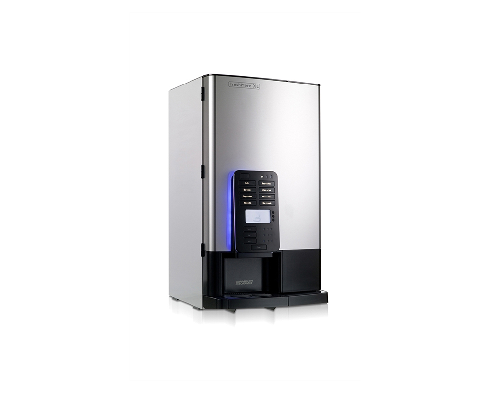 FreshMore XL 511 med 5 behållare för kaffe, kaffe decaf, espresso, cappuccino, varm choklad, moccachino och hetvatten. Med väljarknapp för att lägga till socker och/eller mjölk i kaffet. För utrymmen med vattenanslutning. Kaffeautomaten är utrustad med digital styrning, separat hetvattenkran, spillbricka av plast, automatisk avkalkningsindikator och sköljprogram.