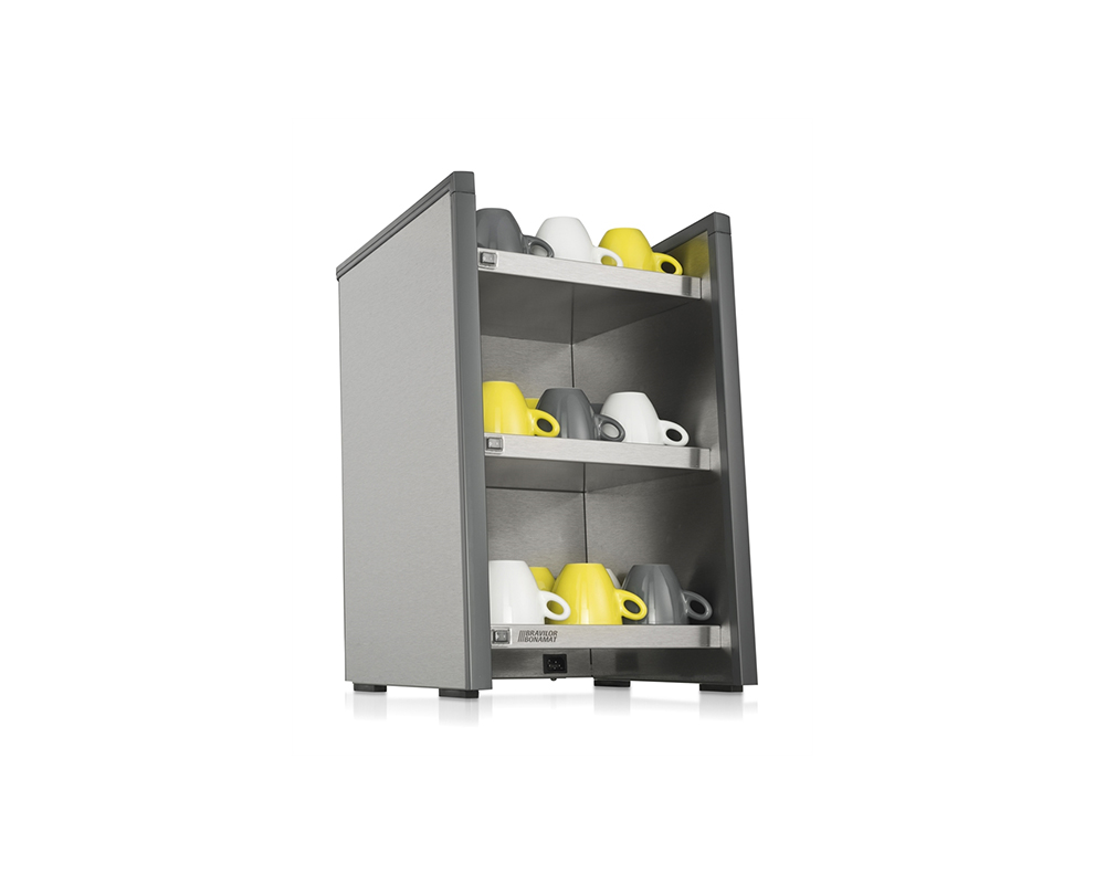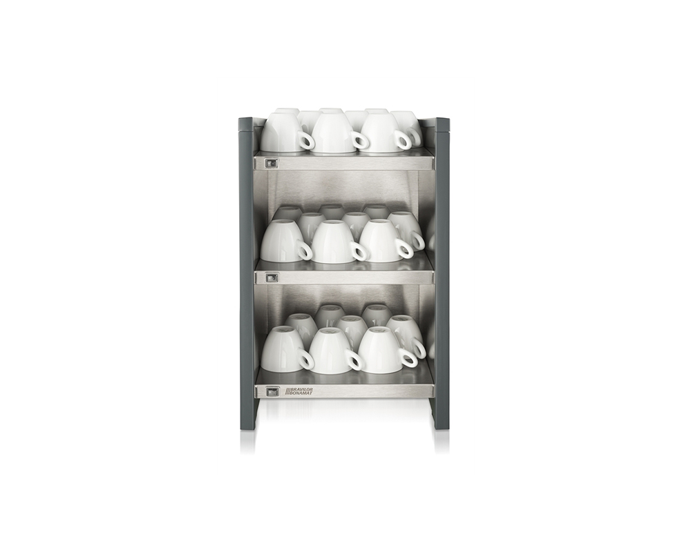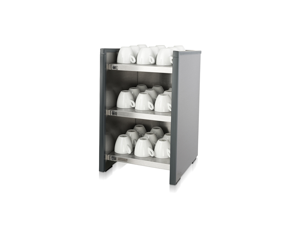 Koppvärmare Stainless Dark som förvärmer dina kaffekoppar och muggar. Den kompakta enheten kan enkelt placeras bredvid din kaffemaskin. Består av tre stycken hyllplan och rymmer totalt 120 koppar.
