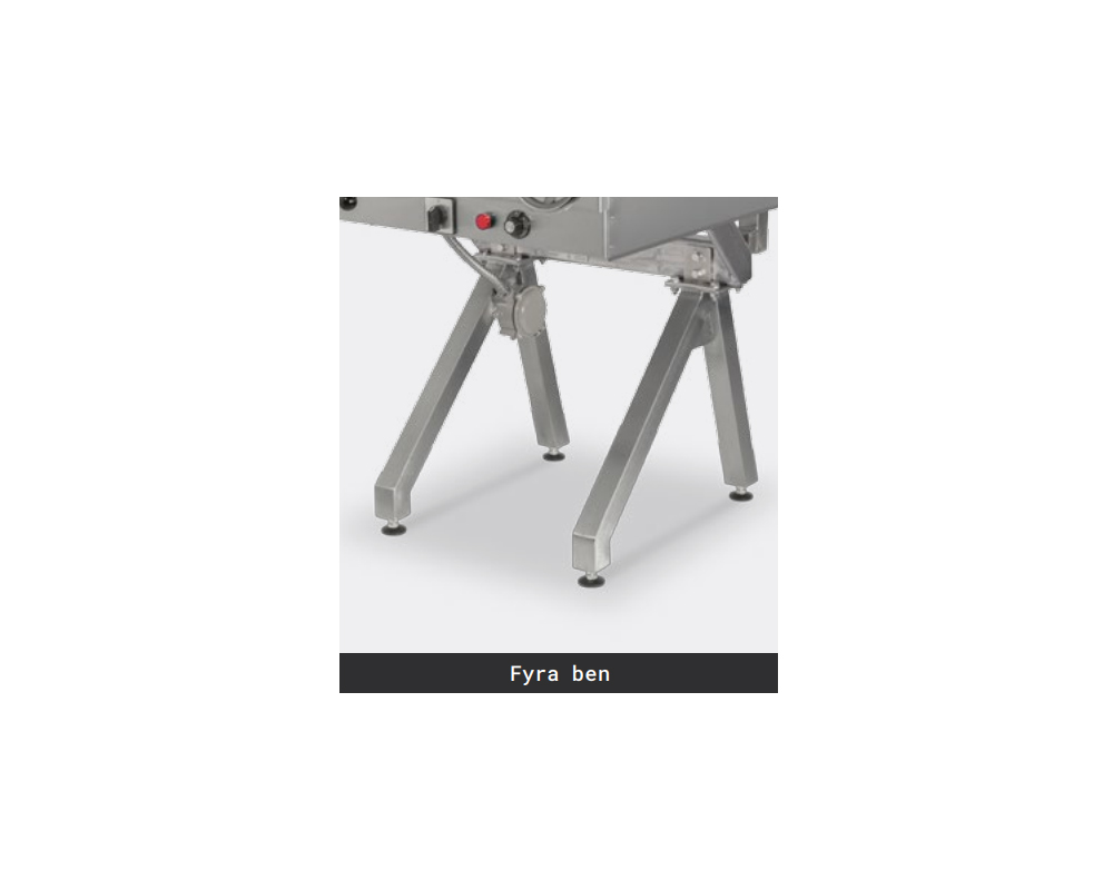 Fyra stycken rostfria ben som går att justera +-2cm. Står stabilt oavsett underlag och behöver inte monteras på plats vilket gör det enkelt att både montera och transportera.
